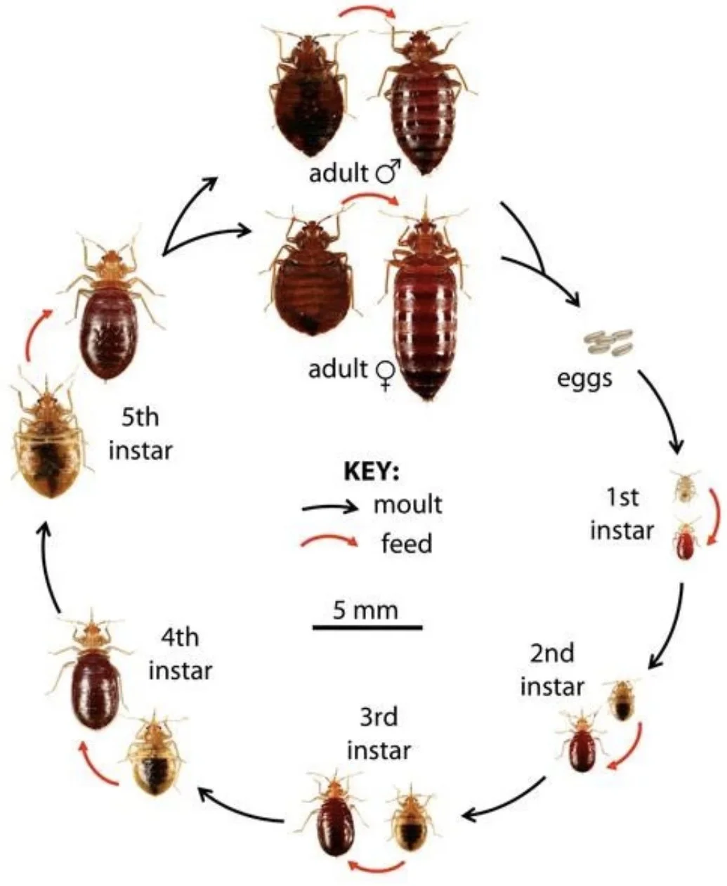 Bed bugs are small, oval-shaped insects that feed exclusively on the blood of humans and warm-blooded animals. They begin their lives in the nymph stage as a creamy white color and darken as they grow into adults, becoming reddish-brown over time.