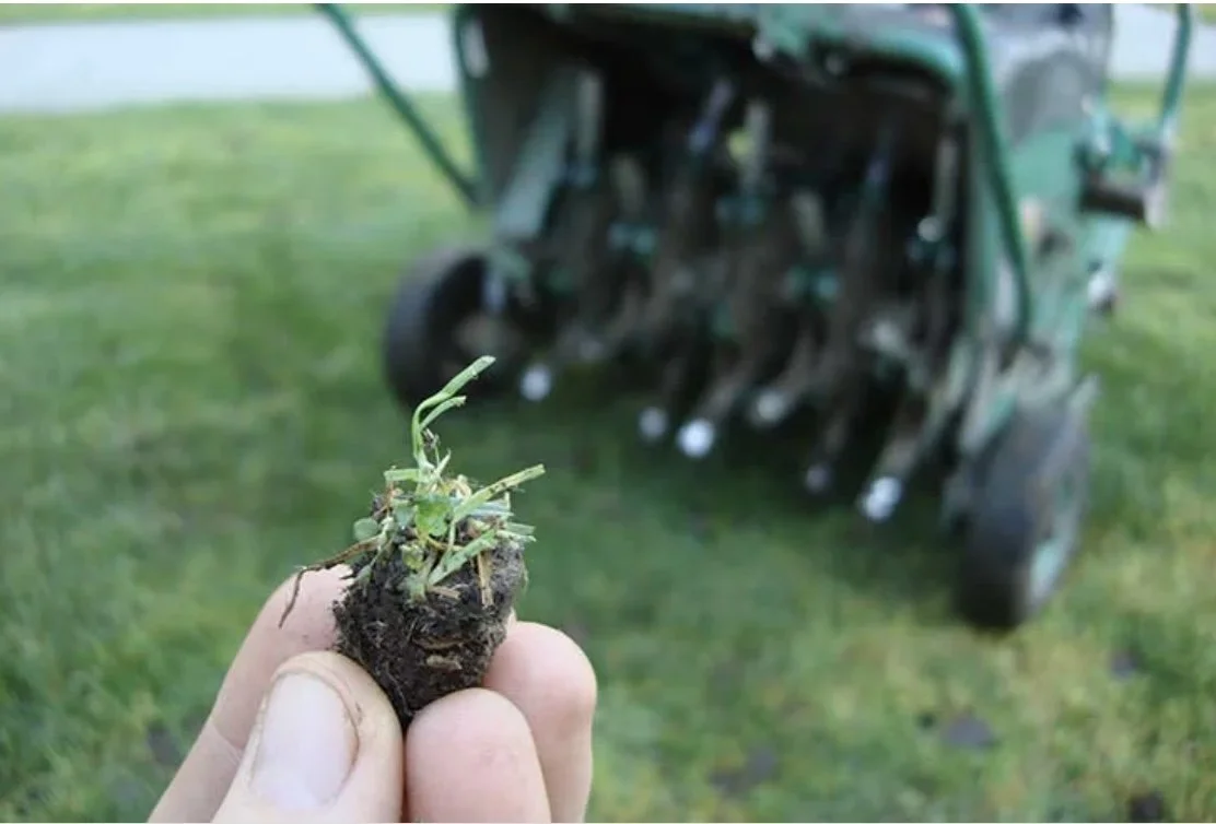 Aeration involves removing small plugs of soil, creating holes that allow air, water, and nutrients to penetrate the soil and reach the grass roots more easily.Benefits: